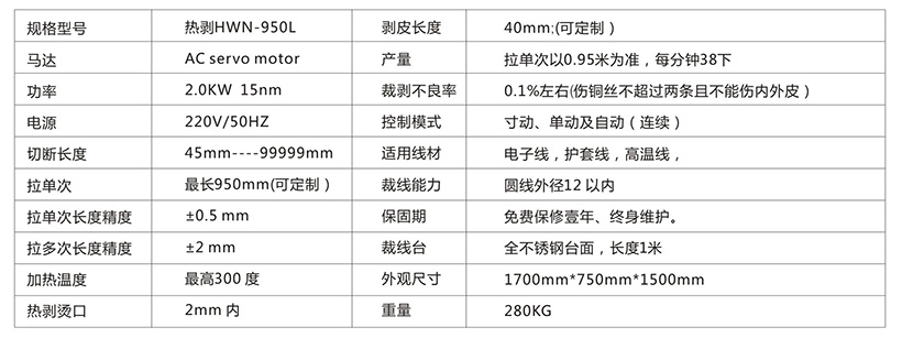 ![]() 一、產(chǎn)品說明: 1、本機是以高速進行線材尺寸切斷、兩端剝皮、單端剝皮及半剝的自動裁線機,使用伺服馬達控制裁線、剝皮等動作、使裁出長度更精準。 2、智能溫控器外殼采用PV阻燃外殼,50-300度自動控制。長度變換及全剝、半剝采用按鍵方式設(shè)定,簡易又快速,剝皮長度及切刀深度之變換采用微調(diào)旋轉(zhuǎn)方式、簡易又快速。 3、本機主要針對電子線、編織線、硅膠線、鐵弗龍線、玻璃纖維線、隔離線、同軸線等研發(fā)的新款機型也可適用于USB.AC.RGB.1394.DC電源線等 二、產(chǎn)品參數(shù): 規(guī)格型號:熱剝HWN-950L 馬 達:AC servo motor 功 率:2.0KW 15nm 電 源:220V/50HZ 切斷長度:45mm----99999mm 拉 單 次:最長950mm(可定制) 拉單次長度精度:±0.5 mm 拉多次長度精度:±2 mm 加熱溫度:最高300度 熱剝燙口:2mm內(nèi) 剝皮長度:40mm;(可定制) 產(chǎn) 量:拉單次以0.95米為準,每分鐘38下 裁剝不良率:0.1%左右(傷銅絲不超過兩條且不能傷內(nèi)外皮) 控制模式:寸動、單動及自動(連續(xù)) 適用線材:電子線,護套線,高溫線 裁線能力:圓線外徑12以內(nèi) 保 固 期:免費保修壹年、終身維護。 裁線臺:全不銹鋼臺面,長度1米 外觀尺寸:1700mm*750mm*1500mm 重 量:280KG